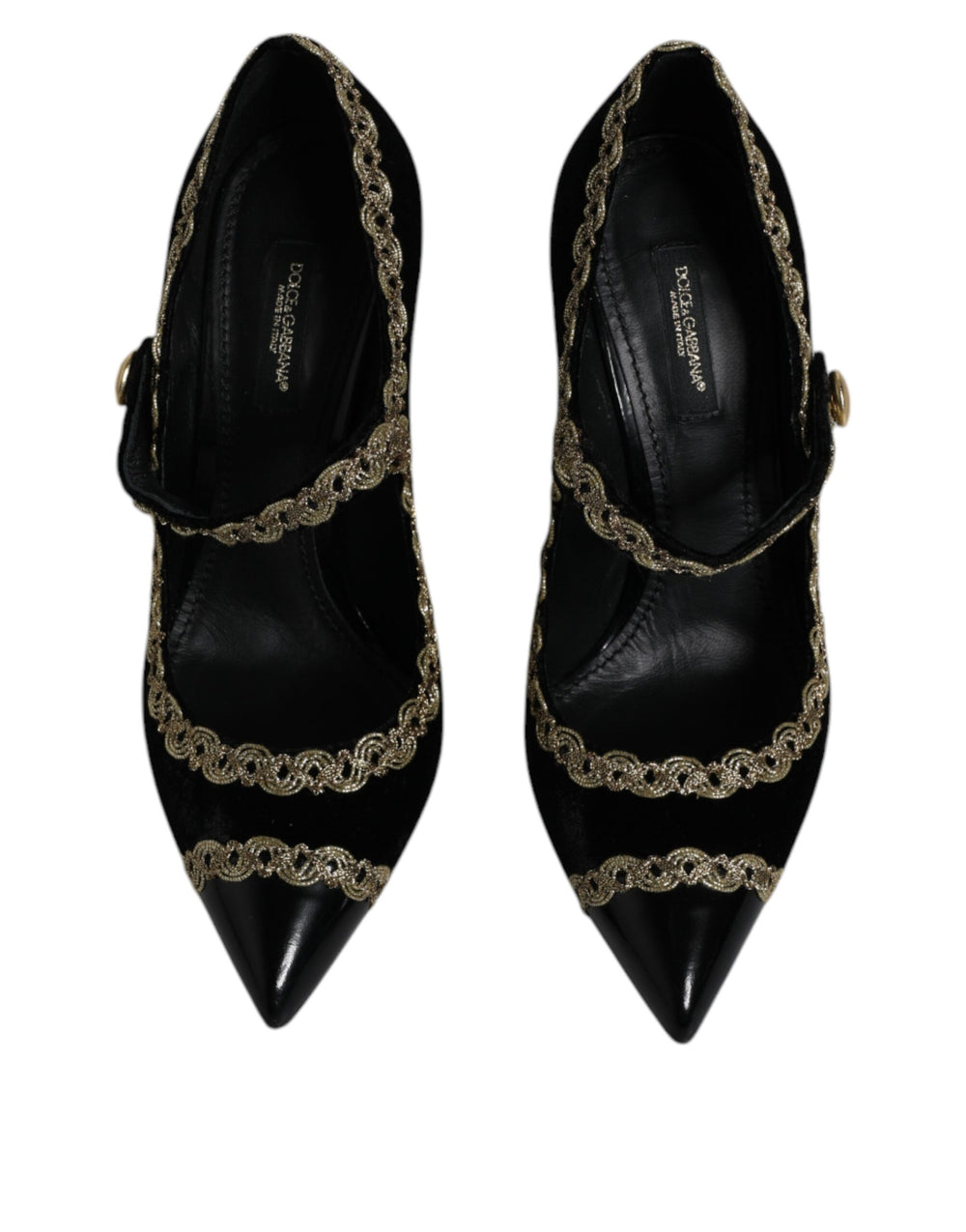Dolce & Gabbana Black Velvet Gold Mary Janes Pumps Shoes