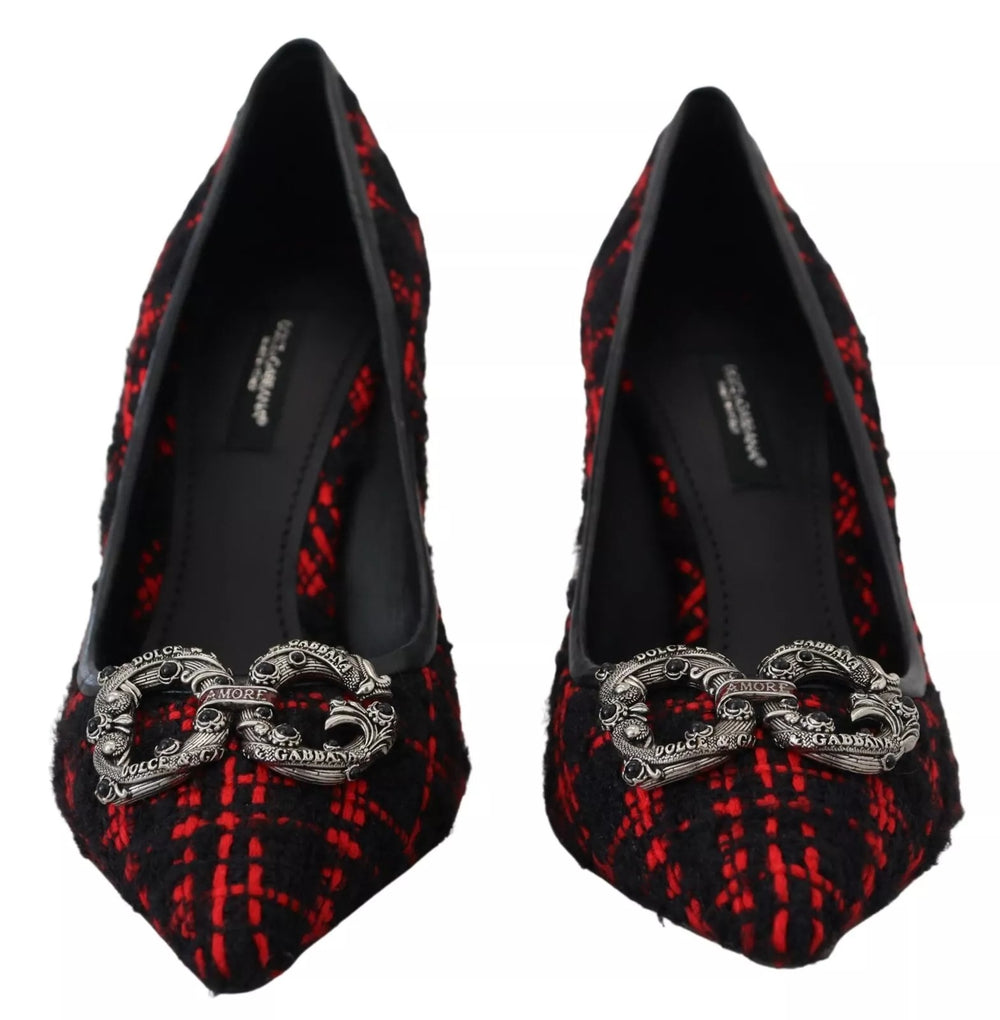 Gorgeous, brand new with tags 100% Authentic Dolce & Gabbana tweed, leather, nappa leather, metal applications, brand logo, two-tone, leather backing, narrow toeline, spool heel, leather sole, contains non-textile parts of animal origin, stilettos. Model: Heels pumps Color: Red Black Material: 40% Cotton, 20% Acrylic, 20% Lambskin, 10% Polyester, 10% Mohair wool Leather bottom sole Logo details Made in Italy