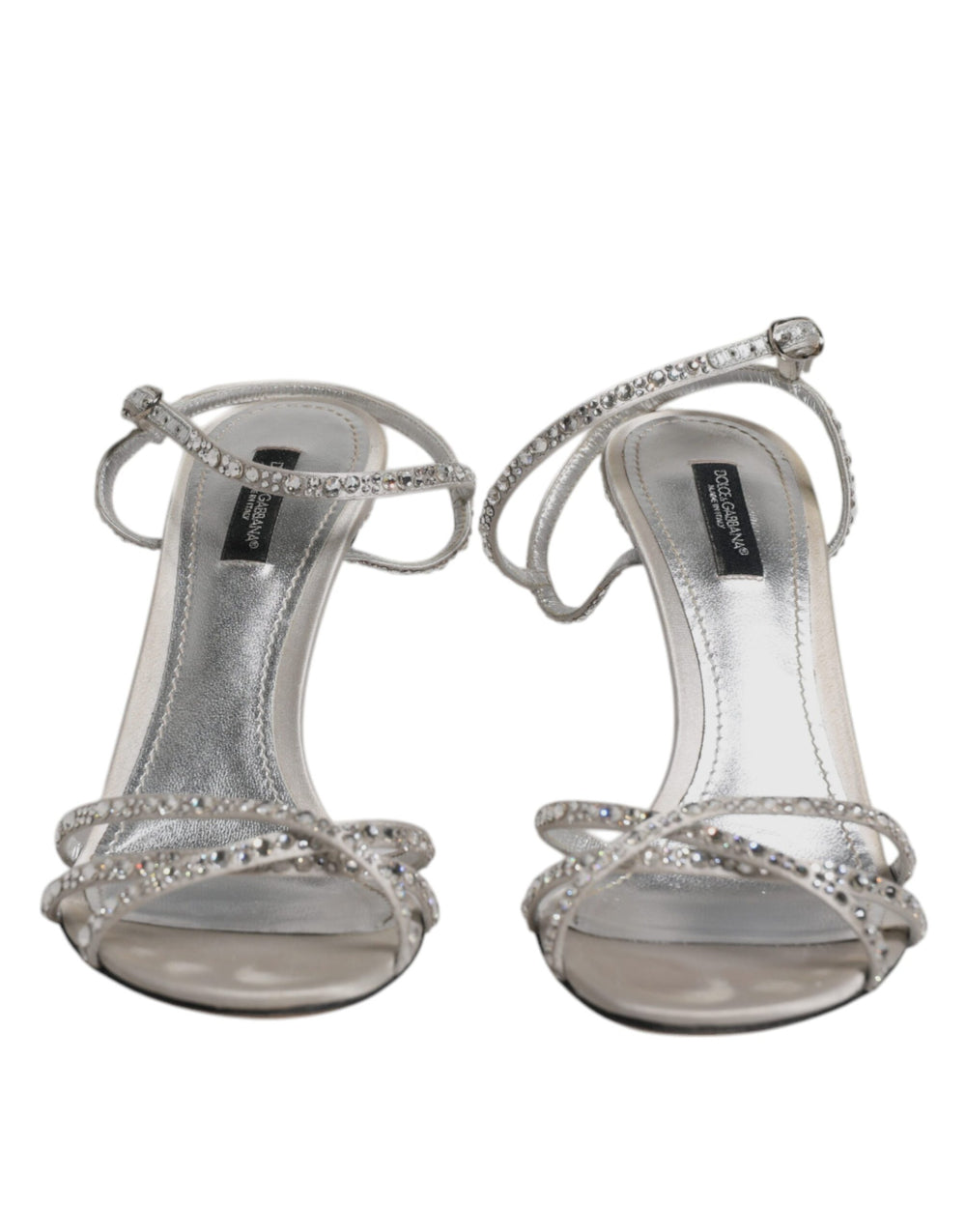Gorgeous preowned with tags, 100% Authentic Dolce & Gabbana embellished ankle strap heels sandals. Model: Heels sandals Color: Silver Material: 31% Silk 67% Viscose 2% Leather Sole: Leather Buckle closure Logo details Made in Italy Very high quality and comfort