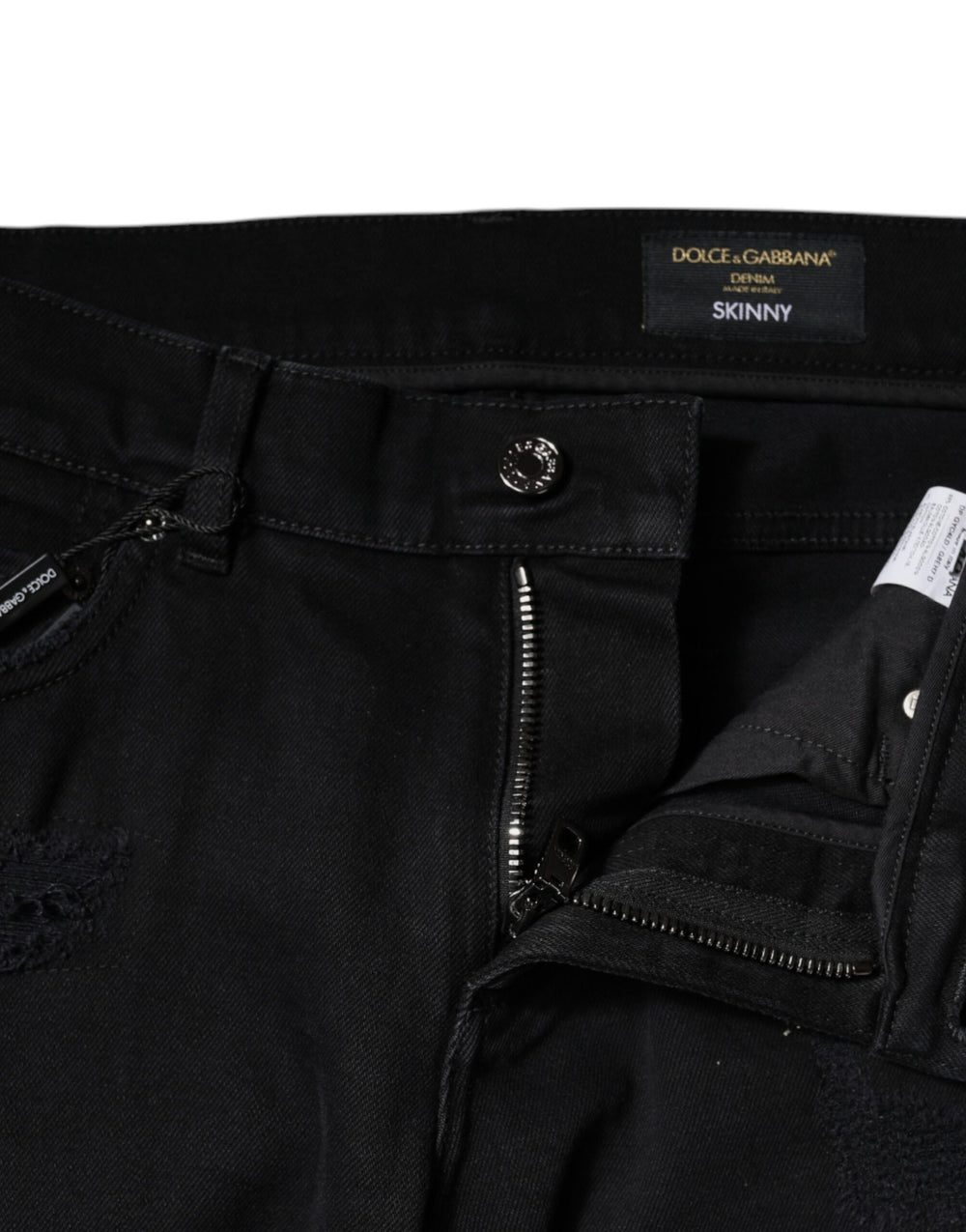 Dolce & Gabbana Black Cotton Tattered Skinny Denim Logo Jeans