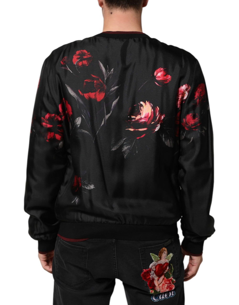 Dolce & Gabbana Black Red Floral Silk Bomber Blouson Jacket
