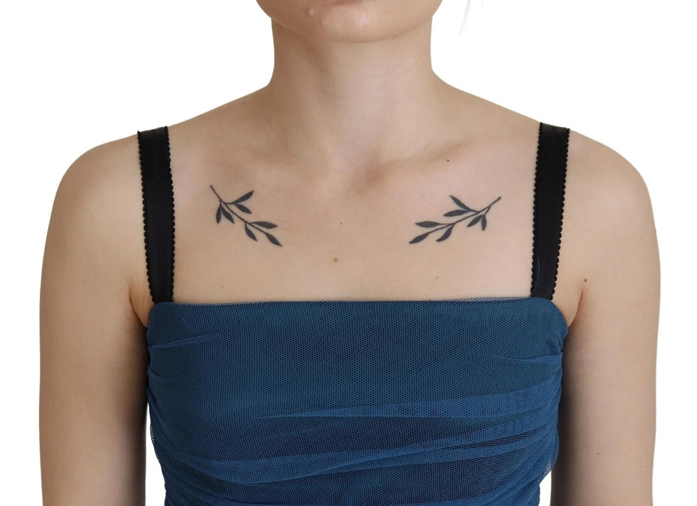 Gorgeous brand new with tags, 100% Authentic Dolce & Gabbana Blue ruched tulle sleeveless bodycon midi dress. Model: Midi bodycon dress Color: Blue Zipper closure Logo details Made in Italy Material: 50% Cotton 25% Nylon 20% Elastane 5% Silk Lining: 65% Acetate 29% Nylon 6% Elastane